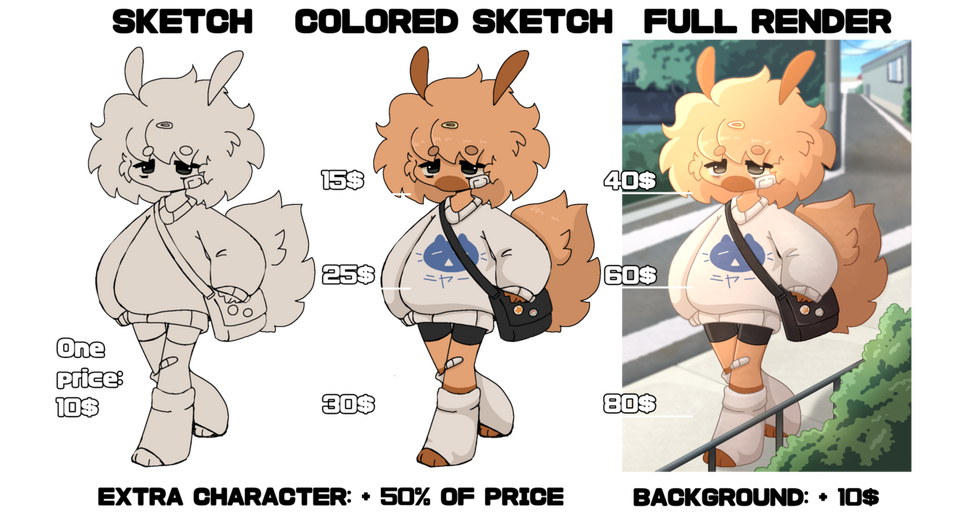 If your character has too many details (like spots or stripes), there are unusual elements in the design (like a fire tail or water hair), huge wings or additional limbs, I will ask for an additional $ 15, since such characters are much more difficult to draw